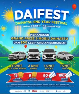 Promo Daihatsu bulan Oktober 2025 adalah program DAIFEST (Daihatsu End Year Festival) yang berlangsung dari 1 Oktober hingga 31 Desember 2025. Promo ini memberikan kesempatan kepada pelanggan untuk mendapatkan grand prize berupa 9 unit mobil Daihatsu, termasuk All New Xenia, Rocky, Sigra, dan Ayla. Selain itu, ada juga hadiah tambahan seperti logam mulia dan voucher belanja. Pelanggan yang membeli mobil Daihatsu selama periode promo berhak mengikuti undian berhadiah dan peluang menang akan lebih besar jika pembelian dilakukan melalui jaringan ekosistem Astra sepertiĀ ACC, Adira, Muf dan TAF.